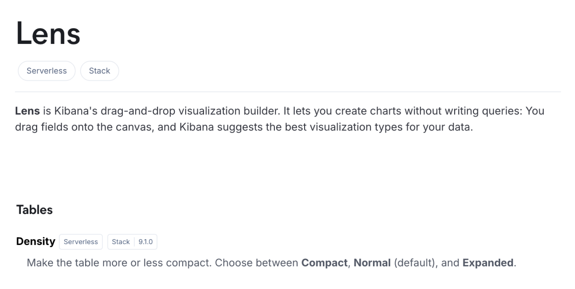 For example, the majority of the content on the Lens page was applicable to both Elastic Stack and to Serverless. One specific section describes functionality that was in technical preview in Elastic Stack 9.0.0 and Serverless at the time Elastic Stack 9.0.0 was released. Then, the functionality became generally available in Elastic Stack in 9.1.0 and shortly before the Elastic Stack 9.1.0 release in Serverless.