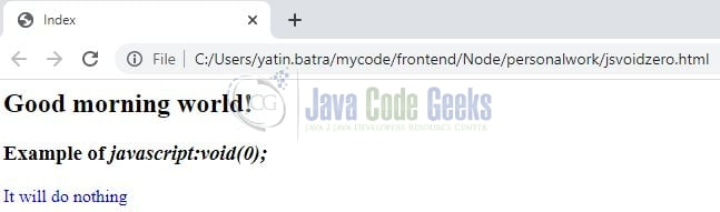 In this tutorial, we learned about javascript:void(0) keyword and created a simple HTML application. You can download the source code from the Downloads section.