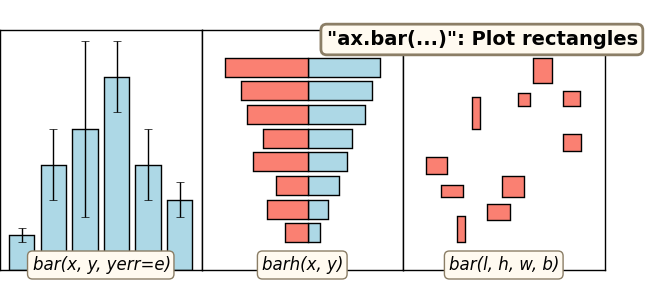 #!/usr/bin/env python # coding: utf-8 # # Part 2: Visual Overview of Plotting Functions # # We've talked a lot about laying things out, etc, but we haven't talked about actually plotting data yet. Matplotlib has a number of different plotting functions -- many more than we'll cover here, in fact. There's a more complete list in the pyplot documentation, and Matplotlib gallery is a great place to get examples of all of them. # # However, a full list and/or the gallery can be a bit overwhelming at first. Instead we'll condense it down and give you a look at some of the ones you're most likely to use, and then go over a subset of those in more detail. # # Here's a simplified visual overview of matplotlib's most commonly used plot types. Let's browse through these, and then we'll go over a few in more detail. Clicking on any of these images will take you to the code that generated them. We'll skip that for now, but feel browse through it later. # ## The Basics: 1D series/points # ### What we've mentioned so far # # # ### Other common plot types # # # # ## 2D Arrays and Images # # # # # ## Vector Fields # # # ## Data Distributions # # # Detailed Examples (of a few of these) # In[ ]: # Let's get our standard imports out of the way from __future__ import print_function import numpy as np import matplotlib matplotlib.use('nbagg') import matplotlib.pyplot as plt # # Input Data: 1D Series # # We've briefly mentioned `ax.plot(x, y)` and `ax.scatter(x, y)` to draw lines and points, respectively. We'll cover some of their options (markers, colors, linestyles, etc) in the next section. Let's move on to a couple of other common plot types. # # ### Bar Plots: `ax.bar(...)` and `ax.barh(...)` # # # Bar plots are one of the most common plot types. Matplotlib's `ax.bar(...)` method can also plot general rectangles, but the default is optimized for a simple sequence of x, y values, where the rectangles have a constant width. There's also `ax.barh(...)` (for horizontal), which makes a constant-height assumption instead of a constant-width assumption. # In[ ]: np.random.seed(1) x = np.arange(5) y = np.random.randn(5) fig, axes = plt.subplots(ncols=2, figsize=plt.figaspect(1./2)) vert_bars = axes[0].bar(x, y, color='lightblue', align='center') horiz_bars = axes[1].barh(x, y, color='lightblue', align='center') # I'll also introduce axhline & axvline to draw a line all the way across the axes # This can be a quick-n-easy way to draw an axis "spine". axes[0].axhline(0, color='gray', linewidth=2) axes[1].axvline(0, color='gray', linewidth=2) plt.show() # Note that we held on to what `ax.bar(...)` returned. Matplotlib plotting methods return an `Artist` or a sequence of artists. Anything you can see in a Matplotlib figure/axes/etc is an `Artist` of some sort. Most of the time, you will not need to retain these returned objects. You will want to capture them for special customizing that may not be possible through the normal plotting mechanism. # # Let's re-visit that last example and modify what's plotted. In the case of `bar`, a container artist is returned, so we'll modify its contents instead of the container itself (thus, `for bar in vert_bars`). # In[ ]: fig, ax = plt.subplots() vert_bars = ax.bar(x, y, color='lightblue', align='center') # We could have also done this with two separate calls to `ax.bar` and numpy boolean indexing. for bar, height in zip(vert_bars, y): if height < 0: bar.set(edgecolor='darkred', color='salmon', linewidth=3) plt.show() # Keep in mind that any plotting method in matplotlib returns the artists that are plotted. We'll use it again, particularly when we get to adding colorbars to images. # ### Filled Regions: `ax.fill(x, y)`, `fill_between(...)`, etc # # # Of these functions, `ax.fill_between(...)` is probably the one you'll use the most often. In its most basic form, it fills between the given y-values and 0: # In[ ]: np.random.seed(1) y = np.random.randn(100).cumsum() x = np.linspace(0, 10, 100) fig, ax = plt.subplots() ax.fill_between(x, y, color='lightblue') plt.show() # However, it can also be used to fill between two curves. This is particularly useful when you want to show an envelope of some sort (e.g. error, confidence, amplitude, etc). # In[ ]: x = np.linspace(0, 10, 200) y1 = 2 * x + 1 y2 = 3 * x + 1.2 y_mean = 0.5 * x * np.cos(2*x) + 2.5 * x + 1.1 fig, ax = plt.subplots() # Plot the envelope with `fill_between` ax.fill_between(x, y1, y2, color='yellow') # Plot the "centerline" with `plot` ax.plot(x, y_mean, color='black') plt.show() # ## `data` keyword argument # When using specialized data structures such as Pandas DataFrame and XArray, the input data to be plotted are accessed like dictionary elements. This can get very repetitive and tedious as one types out a plotting command accessing those elements. So, the `data` keyword argument was added to many of the plotting functions in v1.5. With this feature, one can pass in a single dictionary-like object as `data`, and use the string key names in the place of the usual input data arguments. # # Let's revisit the above example: # In[ ]: x = np.linspace(0, 10, 200) data_obj = {'x': x, 'y1': 2 * x + 1, 'y2': 3 * x + 1.2, 'mean': 0.5 * x * np.cos(2*x) + 2.5 * x + 1.1} fig, ax = plt.subplots() # Plot the envelope with `fill_between` ax.fill_between('x', 'y1', 'y2', color='yellow', data=data_obj) # Plot the "centerline" with `plot` ax.plot('x', 'mean', color='black', data=data_obj) plt.show() # # Exercise 2.1: # # Now let's try combining `bar` and `fill_between` to make a nice prediction of what will happen as this class progresses: # # Can you reproduce the figure below? # # In[ ]: get_ipython().run_line_magic('load', 'exercises/2.1-bar_and_fill_between.py') # In[ ]: import numpy as np import matplotlib.pyplot as plt np.random.seed(1) # Generate data... y_raw = np.random.randn(1000).cumsum() + 15 x_raw = np.linspace(0, 24, y_raw.size) # Get averages of every 100 samples... x_pos = x_raw.reshape(-1, 100).min(axis=1) y_avg = y_