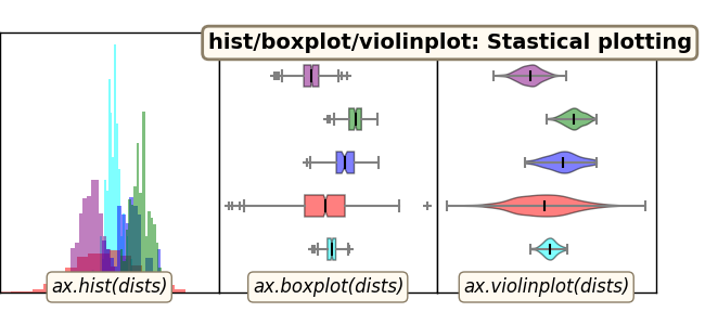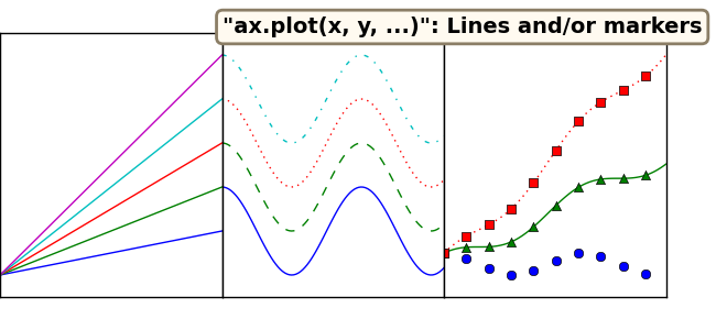 # We've briefly mentioned `ax.plot(x, y)` and `ax.scatter(x, y)` to draw lines and points, respectively. We'll cover some of their options (markers, colors, linestyles, etc) in the next section. Let's move on to a couple of other common plot types.