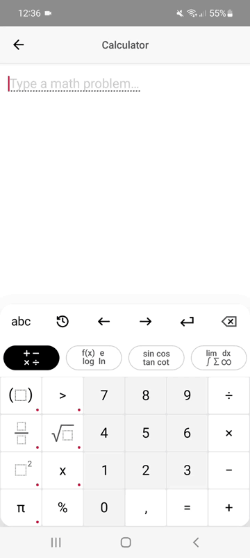 The keyboard is simple to use. Tap to enter any sign and navigate through the problem with arrows in the top row.