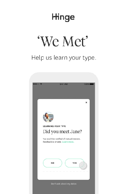 With the launch of We Met, Hinge will now know when dates succeed or fail, and eventually, perhaps, why. It also plans to combine the We Met data with other signals – such as, whether users become inactive in the app or delete their accounts, as well as email survey data – to figure out which dates may have turned into relationships.