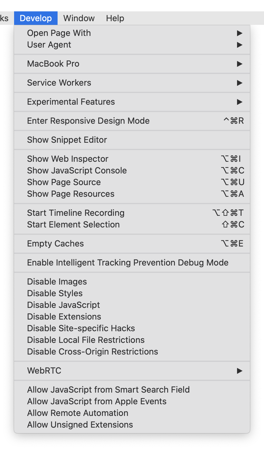 If you’ve ever used Web Inspector before, chances are you’ve used (or are at least familiar with) the Develop menu. It holds action items and toggles for various settings of the browser, like whether local files (e.g. URLs beginning with file://) can be loaded or whether CSS is applied to each page.