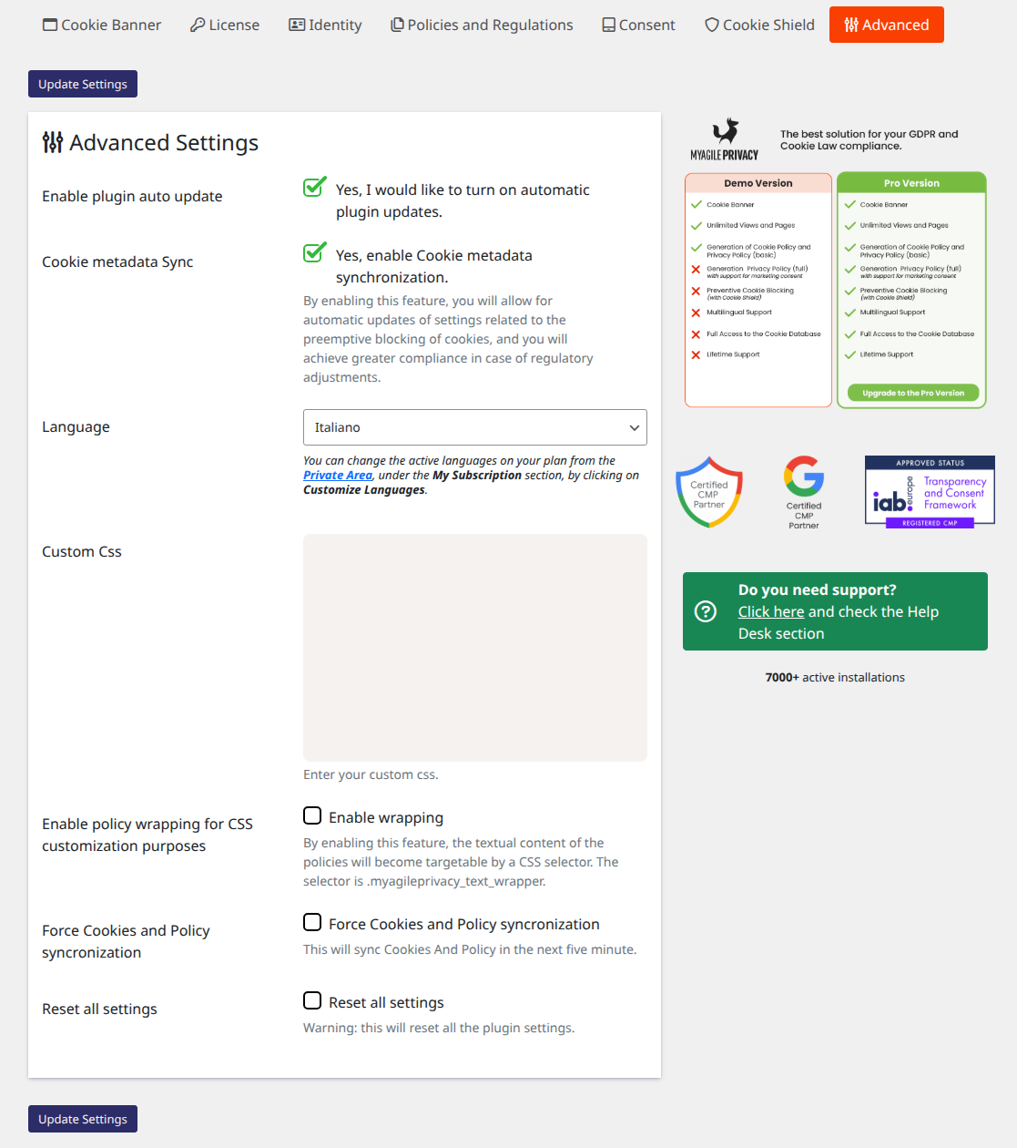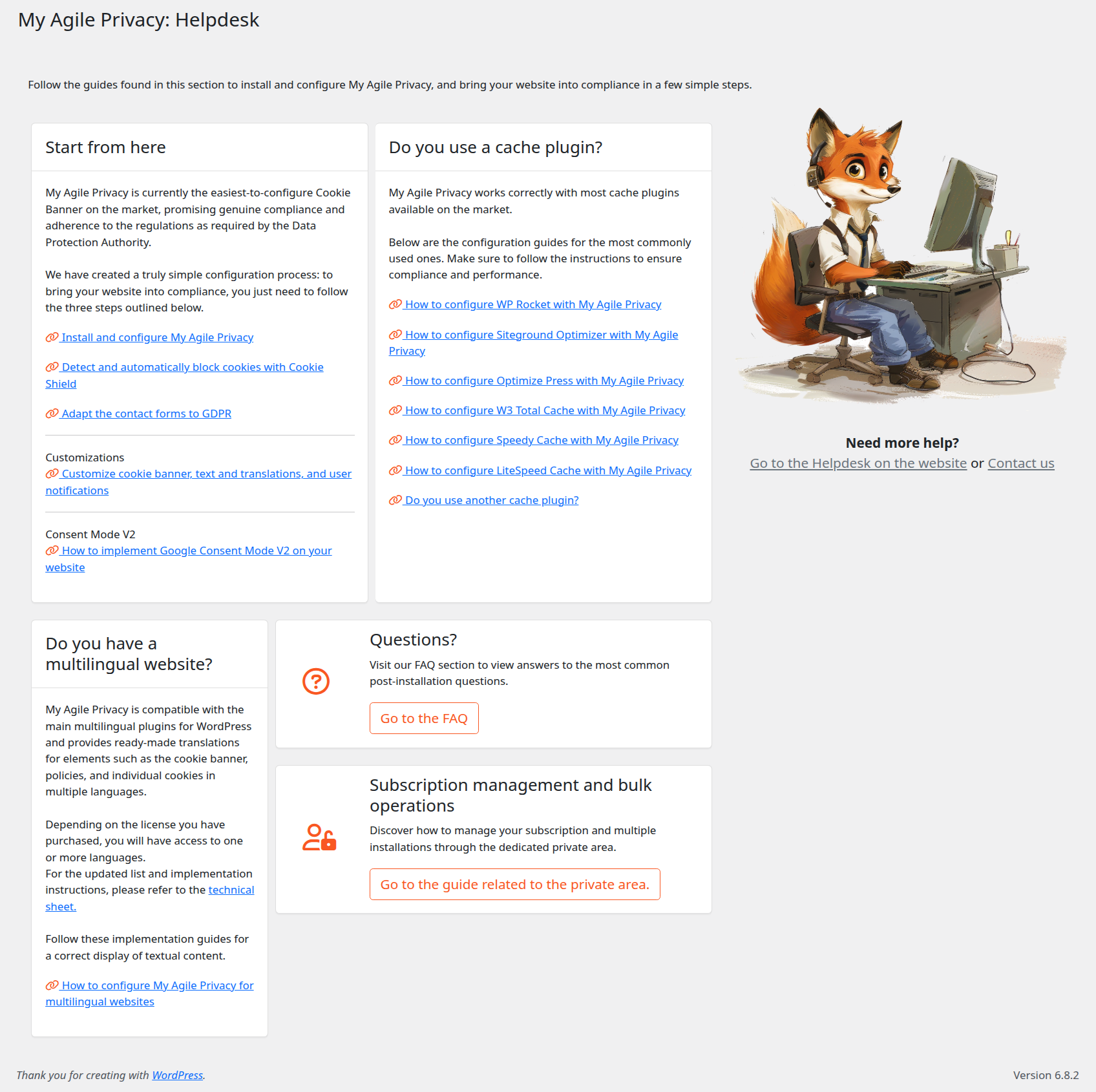 My Agile Privacy is available in English, Spanish, French, German, Italian, Portuguese, Dutch, Polish, and Greek. It supports multilingual sites using WPML, Polylang, TranslatePress, Weglot, or Falang.