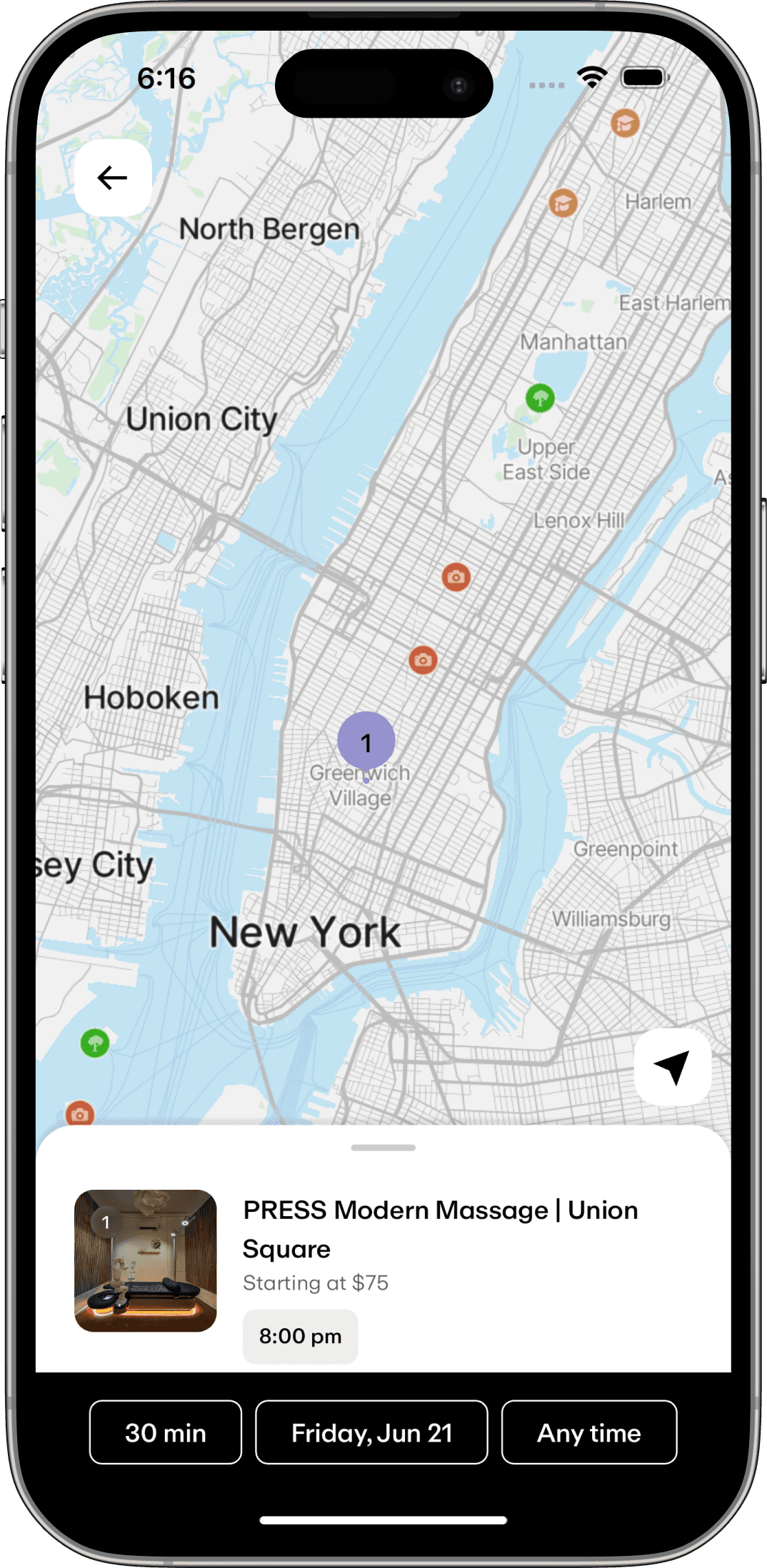 You can use our on-demand booking app to browse locations, check availability and choose the duration (from 15-60 mins). Booking your personalized massage is just a few taps away.