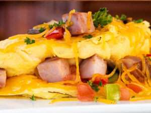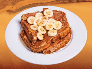 Two slices of battered French toast topped with sliced bananas, caramel drizzle and caramel whip cream. Comes with eggs made your way, choice of bacon, ham or sausage links and a side.