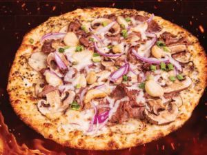 Our house-made dough with a black peppercorn sauce, topped with mozzarella, red onion, mushroom, red potato, garlic, and steak.