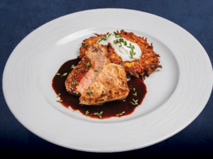 Marinated pork tenderloin served with crispy butternut squash fritters and a savory demi-glace.