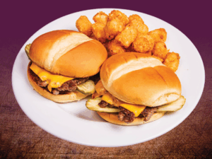 Two classic smash-style burgers with American cheese, pickles and onions. Served with choice of fries, tots or chips.