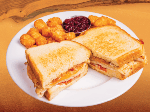 Sliced turkey on toasted sourdough bread with cheddar and Swiss cheese. Topped with mayonnaise, bacon, and tomato. Comes with a side of cranberry sauce and choice of side.