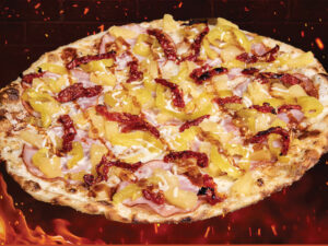 A welcoming break from the winter cold. Sundried tomatoes, banana peppers, pineapple, Canadian bacon, on a garlic herb crust with mozzarella and parmesan cheeses finished with our hot honey and chamoy.
