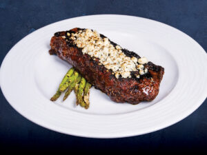 12 oz New York strip steak with blackened seasoning and blue cheese. Served with chef’s choice vegetable.