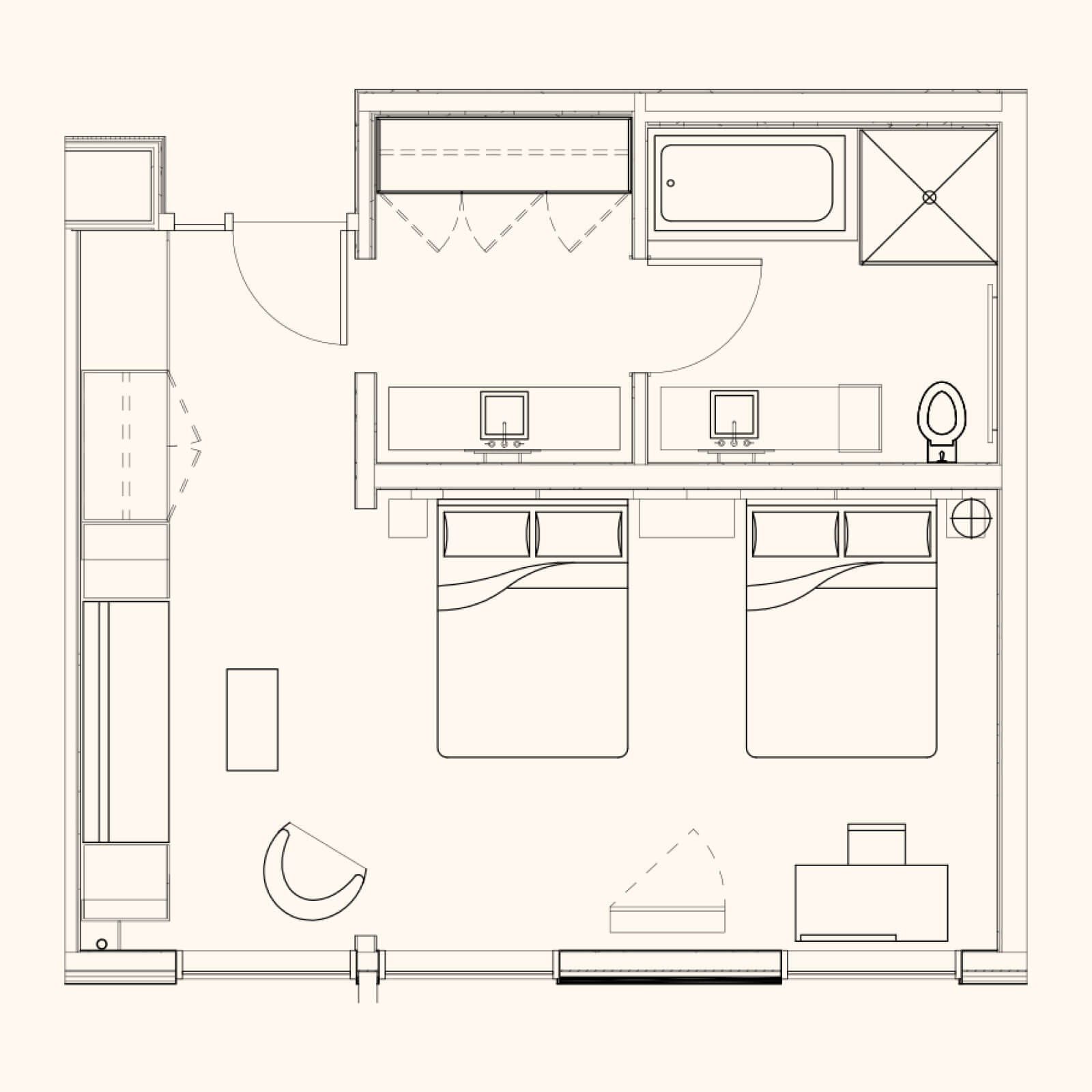 Elegant and comfortable, our spacious Deluxe Double guestroom feature two queen beds, a sitting area and a TV. Enjoy elegant touches including a walk-in shower and beautiful décor.