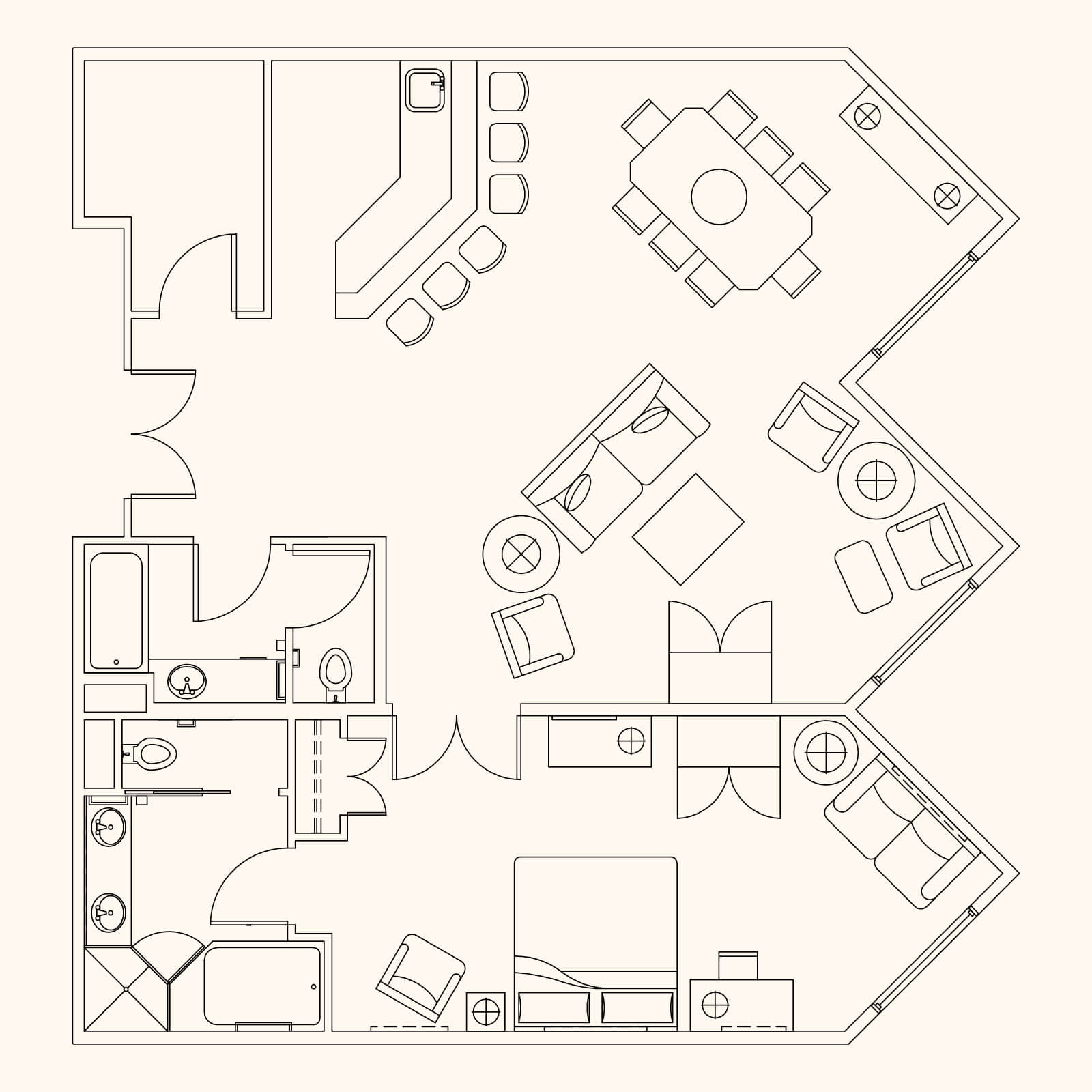 Experience the good life with our lavish executive suite, complete with a feather-top king bed, two televisions, a bar and two bathrooms featuring a three-head, walk-in shower.