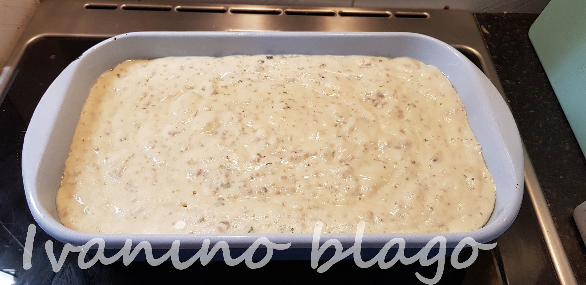 Izliti u nauljen pleh. Moj pleh je dimenzija 19cmx32cm – onaj običan pleh za đuveč koji valjda svi imamo. Ako je vaš pleh veći od iste mere pita će biti tanja, ako želite deblju, srazmerno povećajte broj jaja i broj kašika brašna. Smesa je prilično tečna.