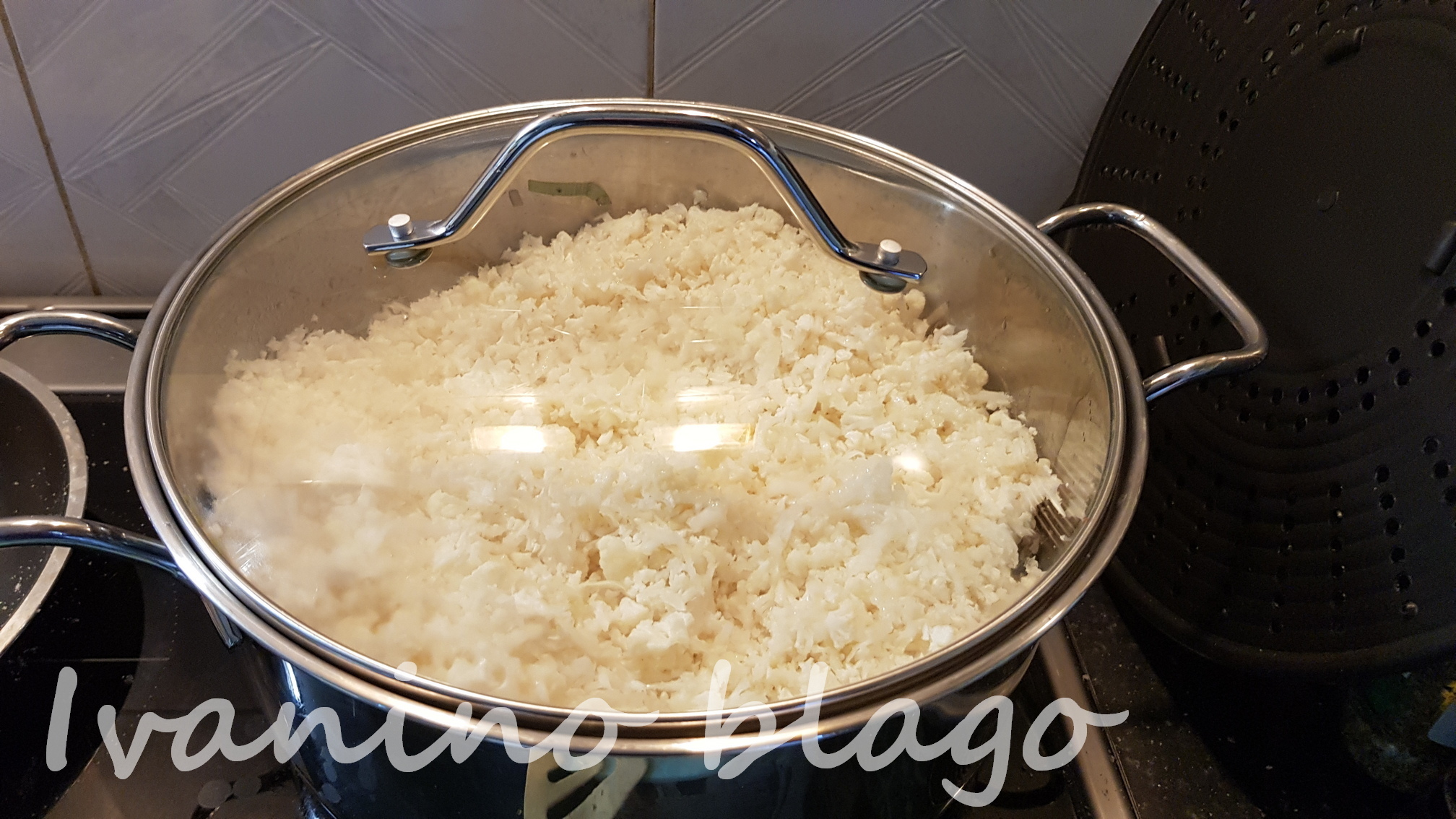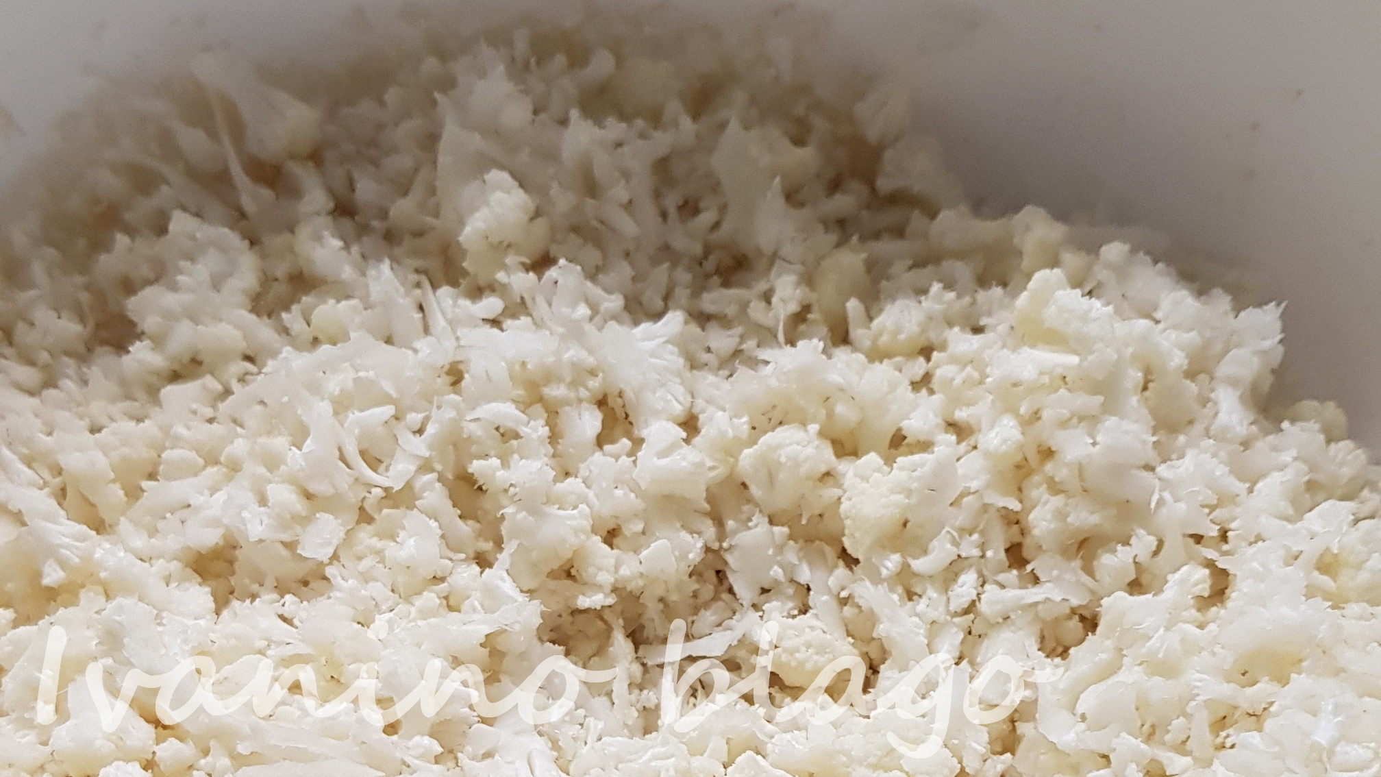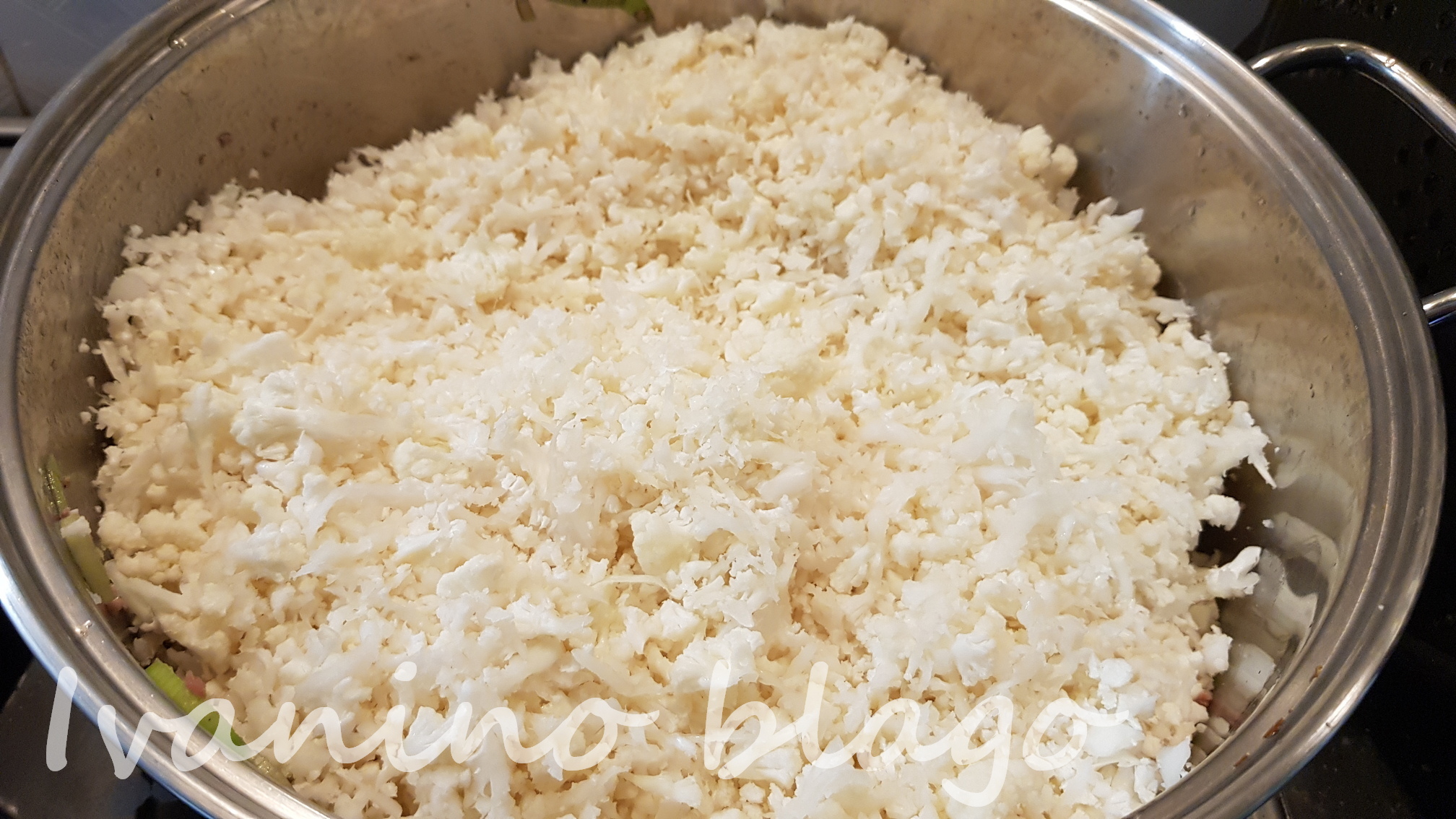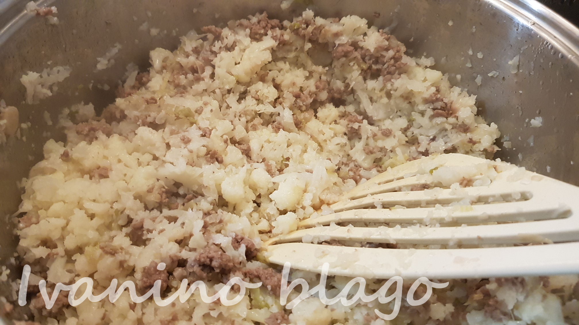 Očistite i oprite karfiol. U blenderu ga iseckajte na sitna zrnca veličine pirinča. Izdinstajte praziluk iseckan na kružiće i meso, začinite po ukusu. Kratko dinstajte samo dok meso promeni boju. Izmešajte obe mase. Poklopite i kratko prodinstajte zajedno, možda 2-3 minuta. Nemojte dodavati vodu jer je karfiol mokar od pranja.