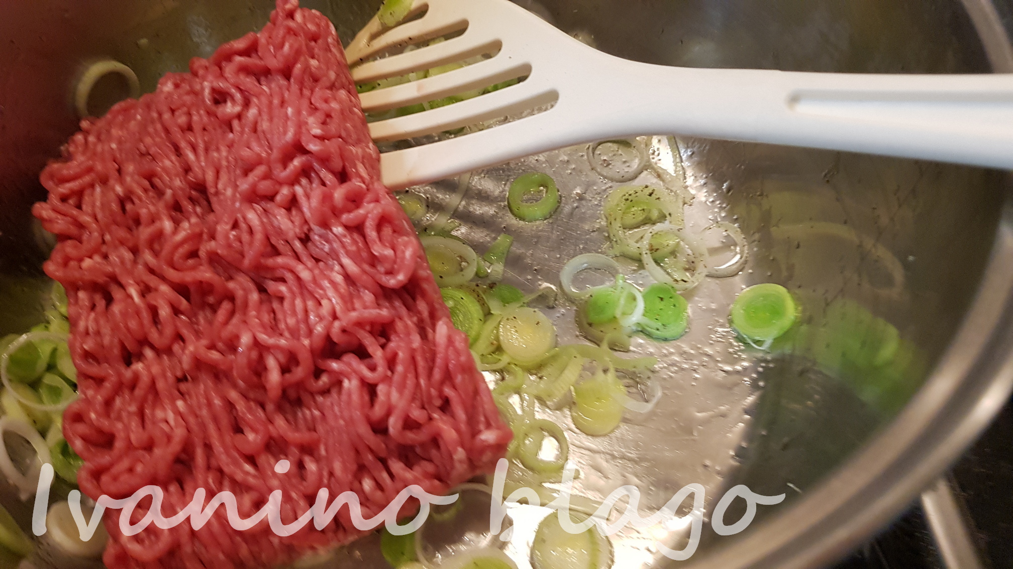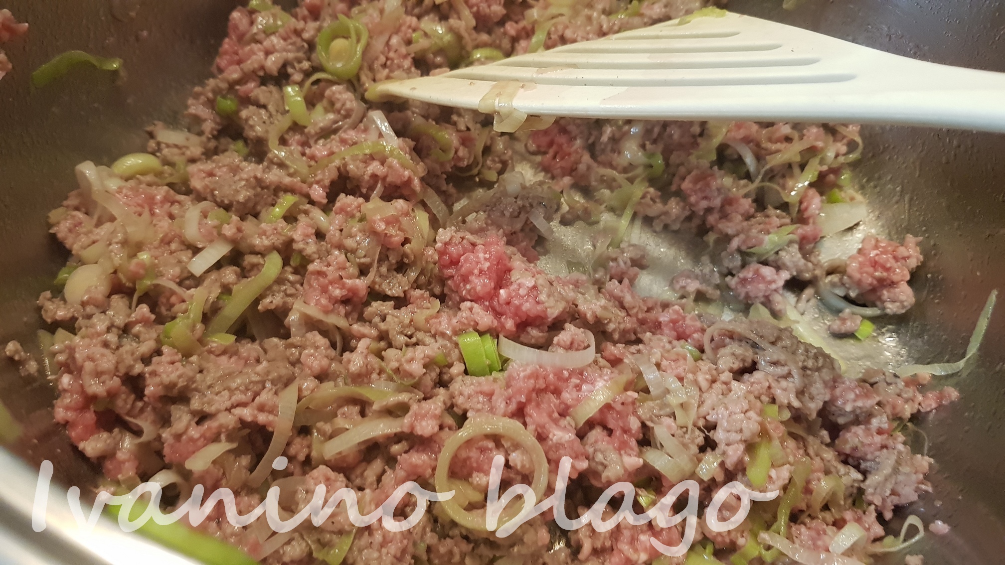 Iseckati i na malo ulja propržiti luk. Dodati meso, malo propržiti dok promeni boju, dodati so, biber, začin i peršun.