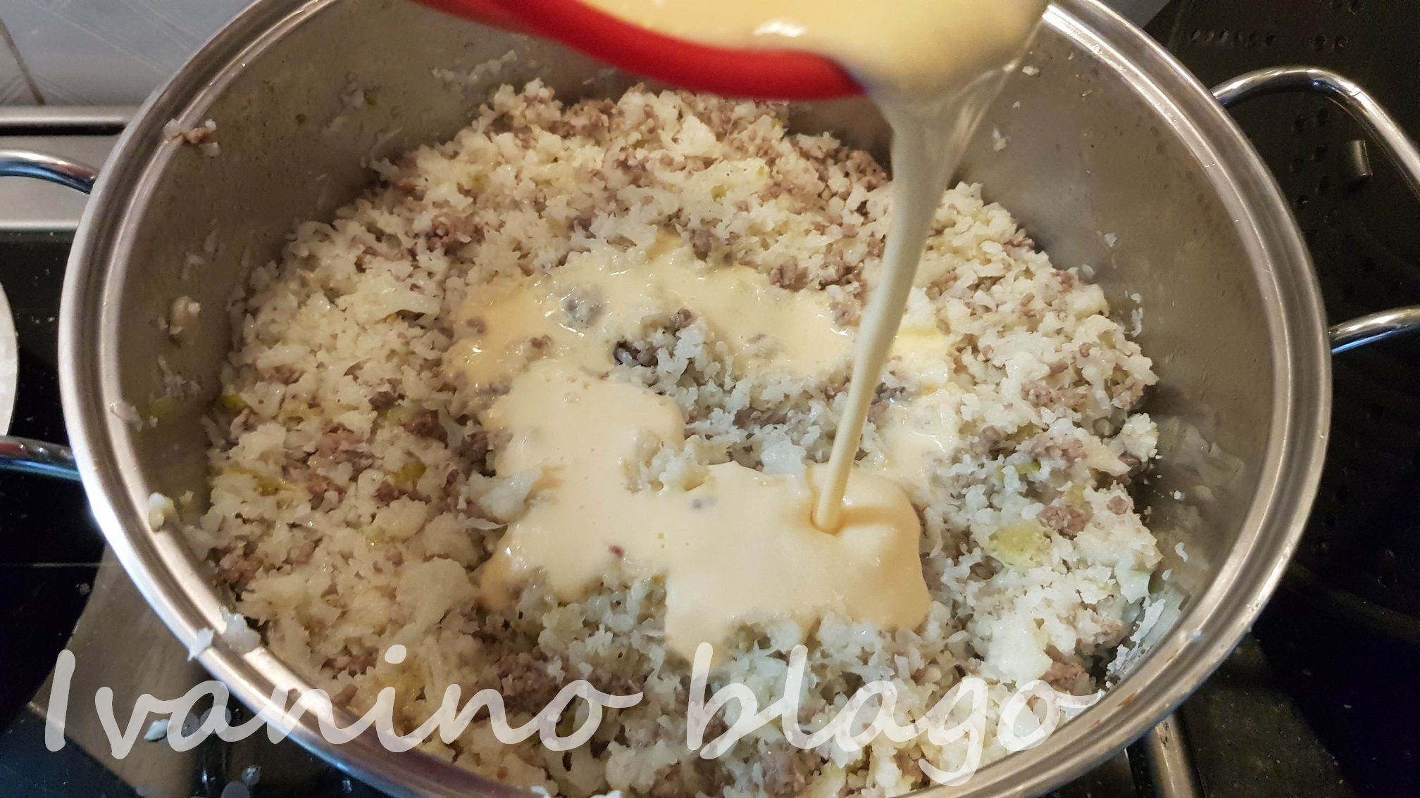 Umutite jaja i grčki jogurt. Posolite. Prelijte preko mesa i karfiola. Ne mešajte.