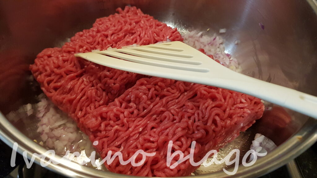 Sitno iseckati luk i malo prodinstati. Dodati meso i dinstati dok ne promeni boju. Posoliti i pobiberiti po ukusu. Onda dodati paradajz iz konzerve. Ako ste kupili ceo pelat, usitniti ga. Da ne biste u konzervi ostavili ostatke sipajte malo vode i isperite ono što je na stranicama ostalo, i to dodajte. Dodajte jednu supenu kašiku paradajz pirea (on će pomoći da se jelo zgusne), malo vuster sosa (ovo možete da izostavite, ali daje baš lep šmek). Možete dodati jednu kašičicu šećera, da ne bi bilo kiselo od paradajza.