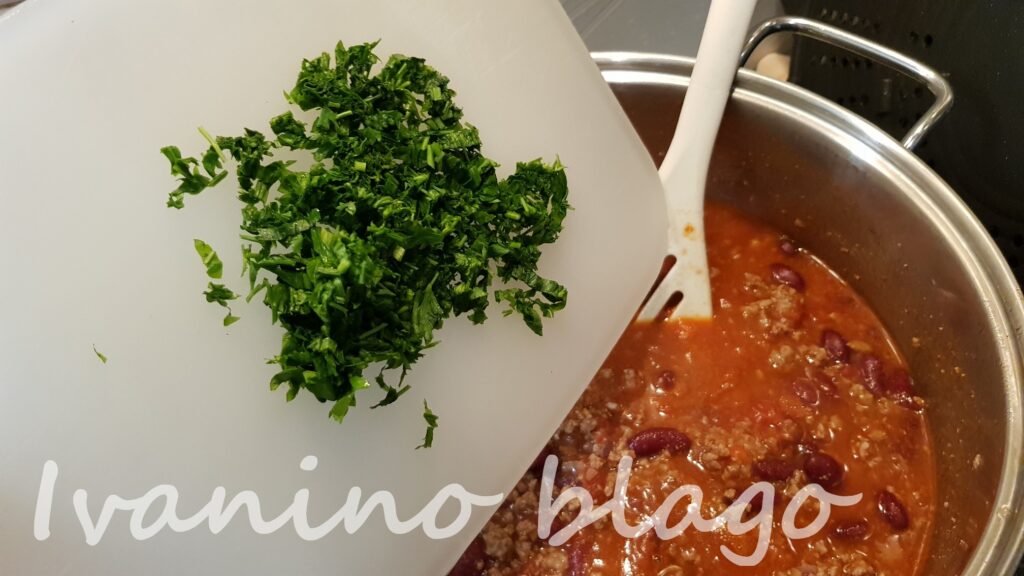 Kad se smesa izjednačila dodajte oceđenu i ispranu jednu konzervu crvenog pasulja i sitno iseckanog peršuna pola vezice.