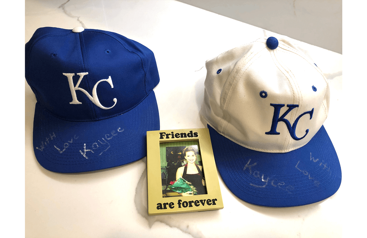 In the framed photo that Kaycee sends to Jim, she wears a black, halter-neck dress, and holds a bouquet of red roses. She is beautiful, young, and happy. She sends two hats with the letters “KC” emblazoned on them. And, in white lettering, she has written in a permanent marker on the hats blue brims: